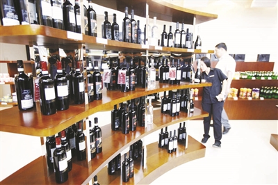 圖為新區(qū)進(jìn)口商品超市中琳瑯滿目的進(jìn)口紅酒 記者 賈磊 攝