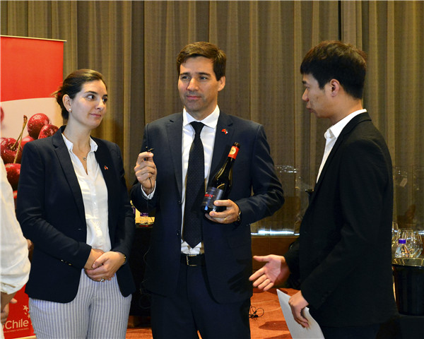 智利駐華使館農(nóng)業(yè)參贊古斯塔沃·弗朗茲(左二)和智利奧希金斯大區(qū)貿(mào)易促進(jìn)局局長瑪利亞·索菲亞·西爾維婭(左一)現(xiàn)場推介當(dāng)?shù)馗叨似咸丫艭erro Basalto 劉通 攝