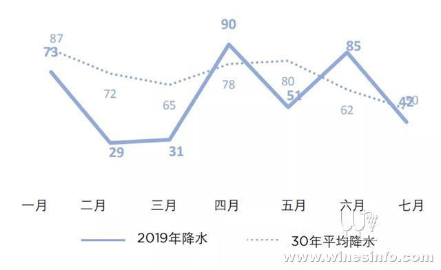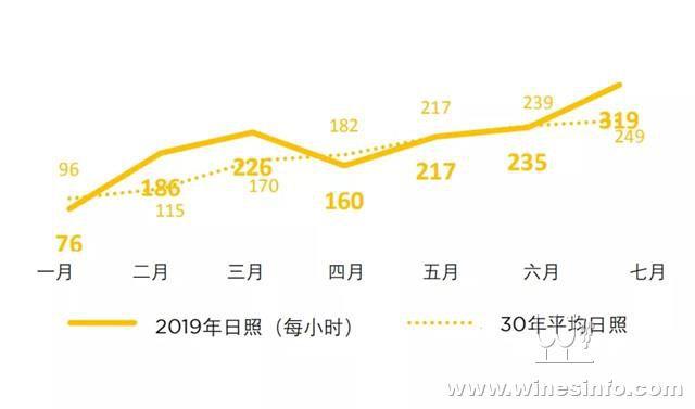 夏季氣溫偏高,時(shí)而炎熱(7月創(chuàng)下歷史氣溫新高),因降水量減少,葡萄成熟的速度減緩。盡管如此,8月中旬的降雨仍對(duì)葡萄生長(zhǎng)有益。
