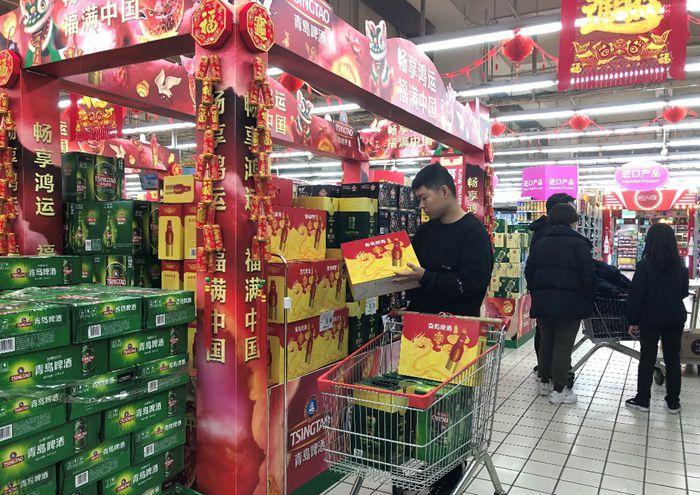 在青島工作多年的劉先生一邊往購物車搬酒一邊說,“今年回家過年,后備箱里預(yù)留的位置,除了海鮮就是啤酒。”在外辛苦一年,回家跟親戚朋友把酒話家常,“除了自己喝,還送親朋好友,像青島啤酒、海鮮都有,把青島的年味帶回家”。