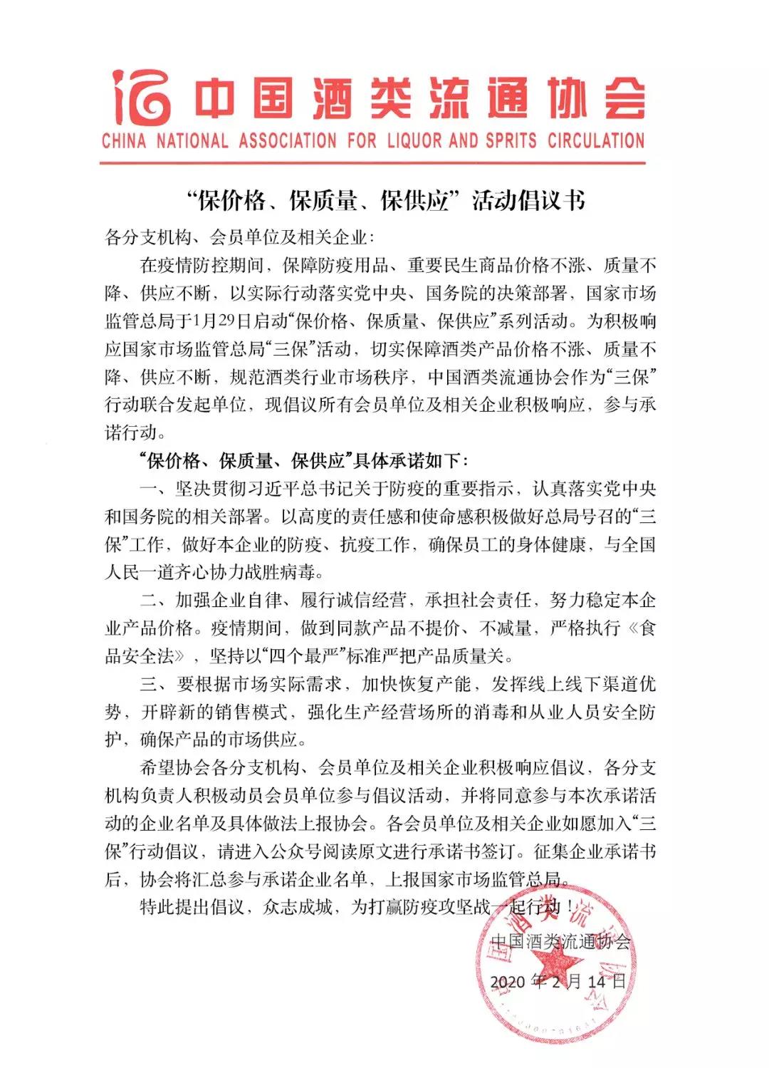 報名參加“三保”酒類企業承諾,將以高度的責任感和使命感積極做好總局號召的“三保”工作,做好本企業的防疫、抗疫工作,確保員工的身體健康,承諾切實保障酒類產品價格不漲、質量不降、供應不斷,規范酒類行業市場秩序。