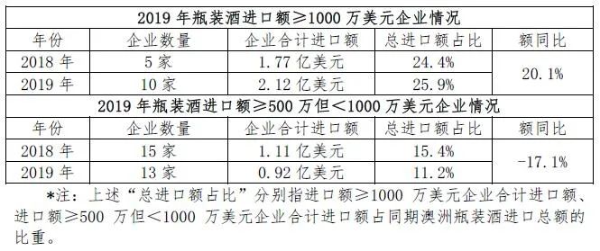 近兩年,頭部企業(yè)對澳洲酒的持續(xù)加碼對進(jìn)口葡萄酒市場格局起到了頭雁效應(yīng)。澳洲瓶裝酒進(jìn)口頭部企業(yè)(指進(jìn)口額≥500萬美元以上的企業(yè))隊(duì)伍有所壯大,且進(jìn)口額呈正向增長(5.6%):其中,2019年進(jìn)口額≥1000萬美元的10家企業(yè)中9家實(shí)現(xiàn)同比增長,僅1家同比下降;進(jìn)口額≥500萬美元的13家企業(yè)中9家實(shí)現(xiàn)同比增長,4家同比下降。