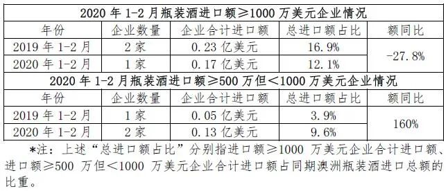 今年1-2月,盡管疫情對行業(yè)有一定沖擊,但澳洲瓶裝酒進(jìn)口頭部企業(yè)基本穩(wěn)住陣腳。雖然進(jìn)口額≥1000萬美元的企業(yè)僅1家,少于去年同期,但其進(jìn)口額同比增長近30%;而進(jìn)口額≥500萬但小于1000萬美元的企業(yè)有2家,數(shù)量增加,其中,1家進(jìn)口額實(shí)現(xiàn)倍數(shù)增長,1家為新的行業(yè)進(jìn)入者。