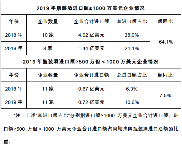 進(jìn)口法國瓶裝酒頭部企業(yè)(指進(jìn)口額≥500萬美元以上的企業(yè))近兩年數(shù)量維持在20家上下,但其2019年進(jìn)口總額,尤其是≥1000萬美元企業(yè)的進(jìn)口總額,絕對值減少近2.6億美元,出現(xiàn)腰斬式銳減(同比-64.1%)。與之形成對比的是,同期同等量級的澳洲酒進(jìn)口商數(shù)量增加并超過法國,且進(jìn)口總額亦實(shí)現(xiàn)超車。