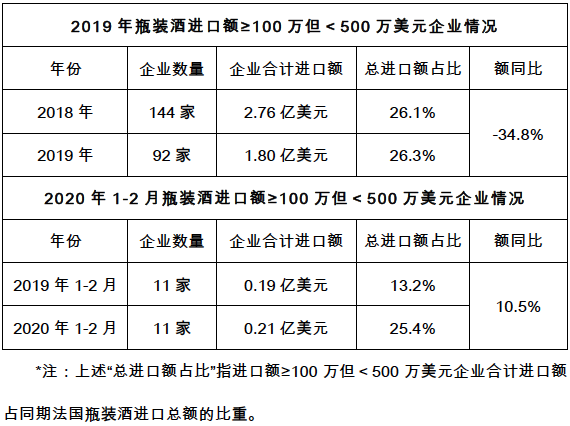 在2019年進(jìn)口葡萄酒市場大盤下行情況下,腰部企業(yè)(指進(jìn)口額≥100萬但<500萬美元的企業(yè))數(shù)量和合計(jì)進(jìn)口額均較快增長。尤其是今年1-2月受到疫情不利影響下,腰部企業(yè)進(jìn)口總額增幅近8成,使得其市場份額占比高于去年同期超16個(gè)百分點(diǎn)。