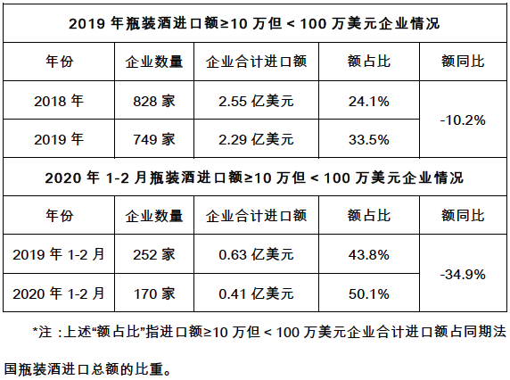 與澳洲一樣,法國瓶裝酒進(jìn)口商中絕大多數(shù)是小型企業(yè)(指進(jìn)口額≥10萬美元但<100萬美元的企業(yè))和微型企業(yè)(指進(jìn)口額<10萬美元的企業(yè)),并都在今年1-2月疫情影響下家數(shù)減少,且進(jìn)口總額高幅低開。
