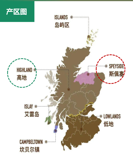 位于蘇格蘭東北部,環繞著斯佩河,這里擁有蘇格蘭數量很多的釀酒廠,斯佩賽威士忌以其復雜和豐富而知名,口感溫和,花香果香豐富濃郁。