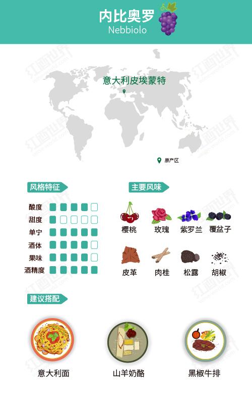 這個葡萄品種不同于我們此前介紹的幾個國際紅葡萄酒品種,它的果皮比較薄,發(fā)芽早但成熟得晚,釀出來的葡萄酒顏色比較淺,但是單寧豐富,酸度高,酒精度也高,通常帶有紅櫻桃和覆盆子等紅色水果與玫瑰、紫羅蘭、松露、皮革、肉桂以及胡椒等風(fēng)味。另外,內(nèi)比奧羅葡萄酒風(fēng)格多變,酒體可輕盈可飽滿,可以存放很多年,并且陳年后風(fēng)味更為復(fù)雜迷人。